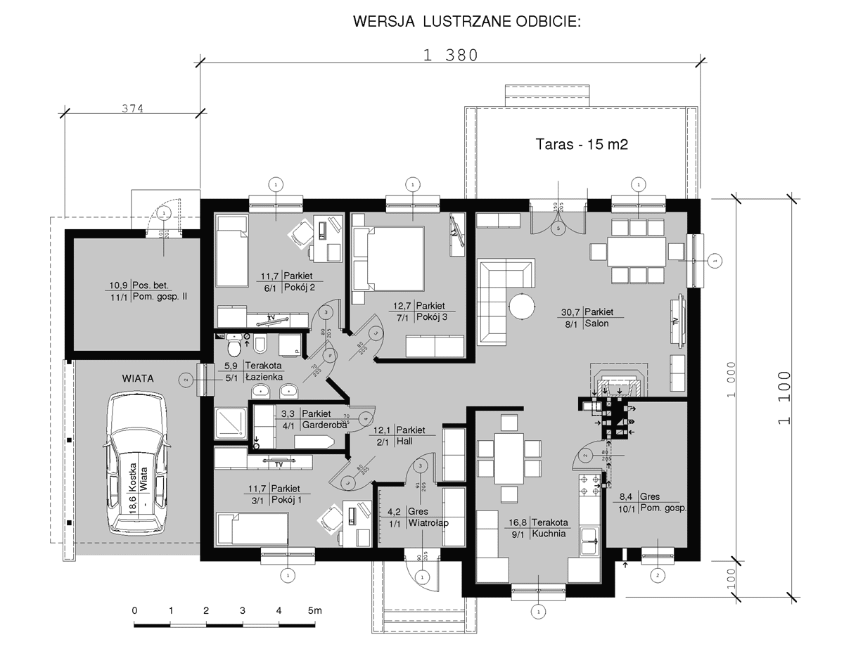7. Duże, wygodne pomieszczenie gospodarcze, umożliwiające zainstalowanie dowolnego pieca (nawet węglowego z automatycznym podajnikiem). Standardowo projektujemy kocioł gazowy.